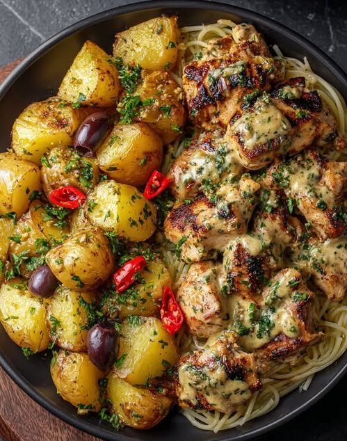 🍋🍗 Mediterranean Creamy Chicken with Potatoes, Olives & Spaghetti