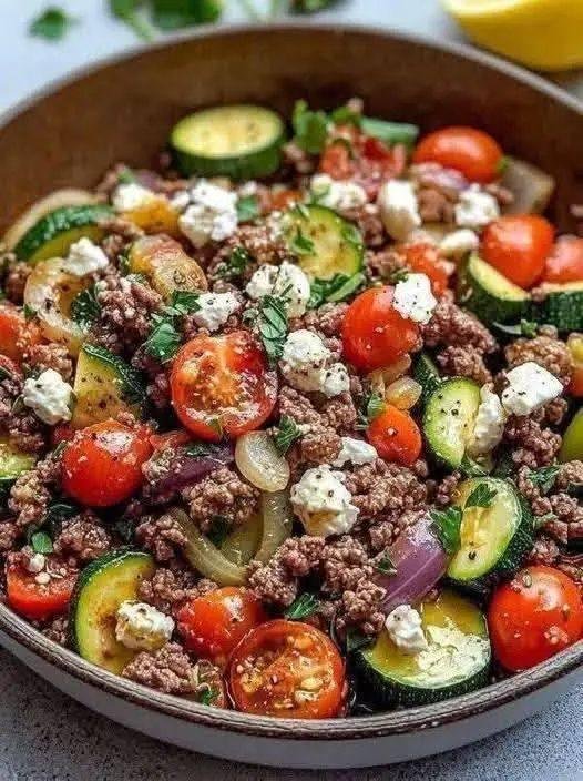 This dish is ideal for busy weeknights, low-carb lifestyles, or anyone who wants a wholesome, protein-rich meal that doesn’t sacrifice taste. Every bite is a harmony of savory beef, bright vegetables, and salty feta, finished with fragrant herbs and olive oil.