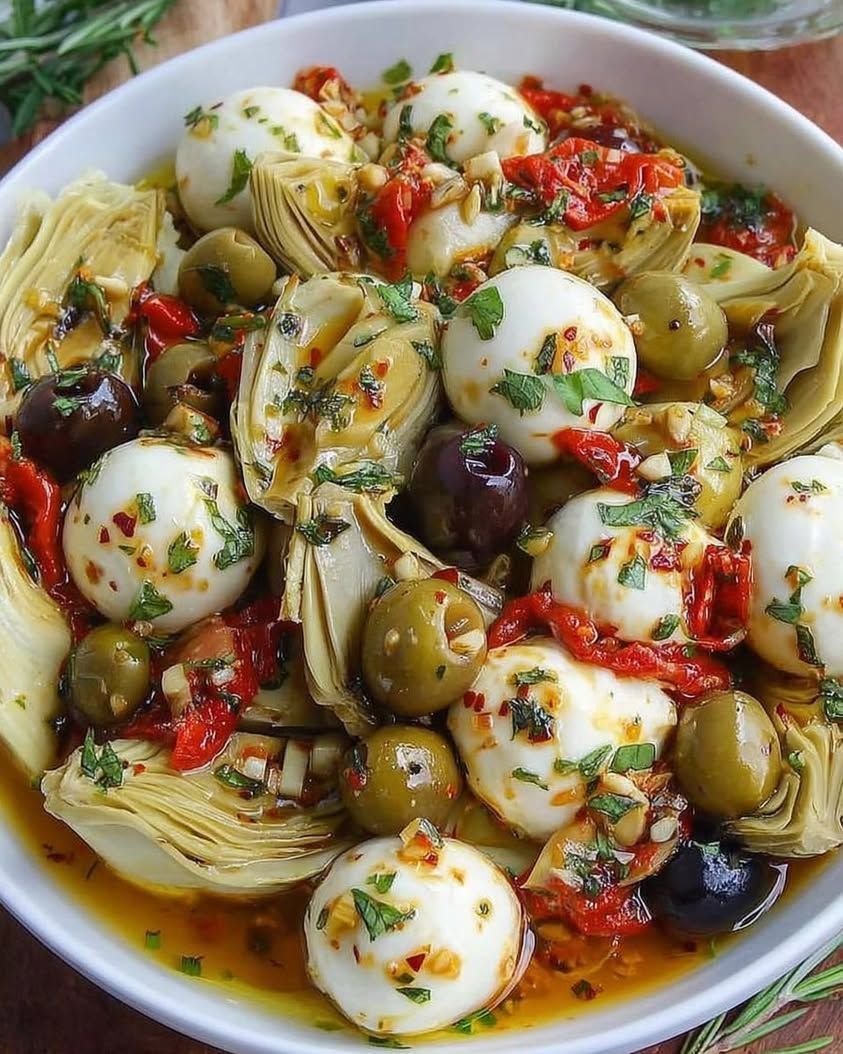 A fresh, flavorful Mediterranean-style salad made with creamy mozzarella balls, tangy olives, tender artichokes, and herbs in a light olive oil dressing. It’s low-carb, high in healthy fats, and perfect for weight loss and blood sugar control when portioned right.