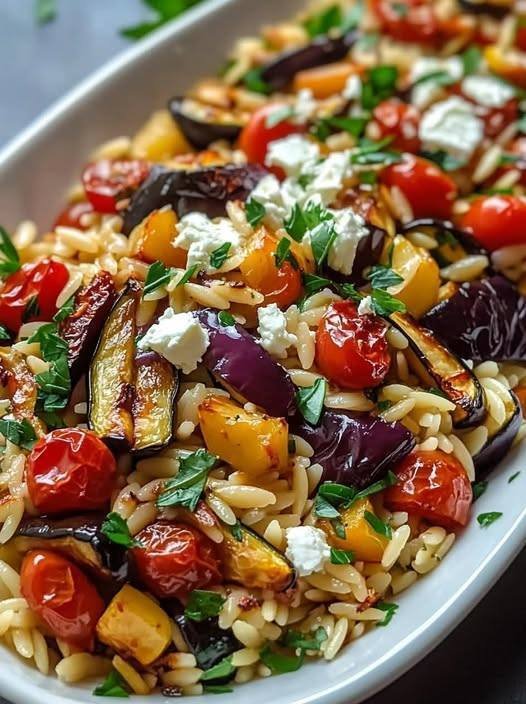 🌿 Mediterranean Orzo Salad with Fire-Roasted Vegetables, Fresh Herbs & Creamy Feta
