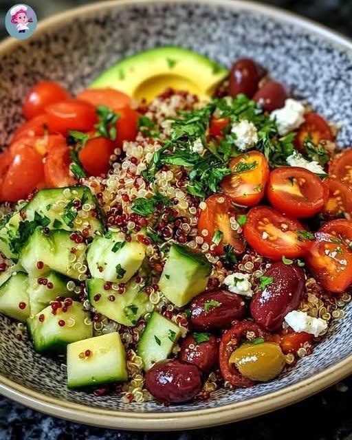 Mediterranean Quinoa Salad with Avocado & Roasted Red Peppers.