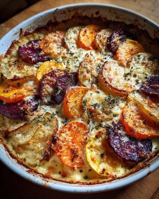 A colorful, creamy, and wholesome gratin dish layered with Mediterranean herbs, sweet potatoes, parsnips, and earthy beets. Perfect as a cozy side dish or even a vegetarian main.