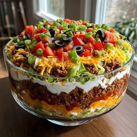 A vibrant layered salad with spiced lean beef, crisp veggies, creamy yogurt sauce, olives, and herbs. It keeps the fun of a taco salad but leans into Mediterranean flavors—fresh, zesty, and satisfying.