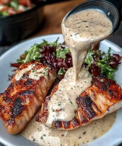 🌿 Mediterranean Tuna Steaks with Creamy Garlic Sauce & Fresh Herb Salad