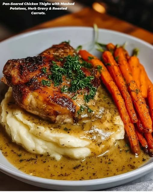 🍗 Pan-Seared Chicken Thighs with Mashed Potatoes, Herb Gravy & Roasted Carrots