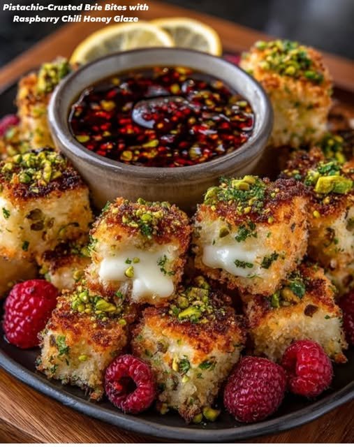 Pistachio-Crusted Brie Bites with Raspberry Chili Honey Glaze