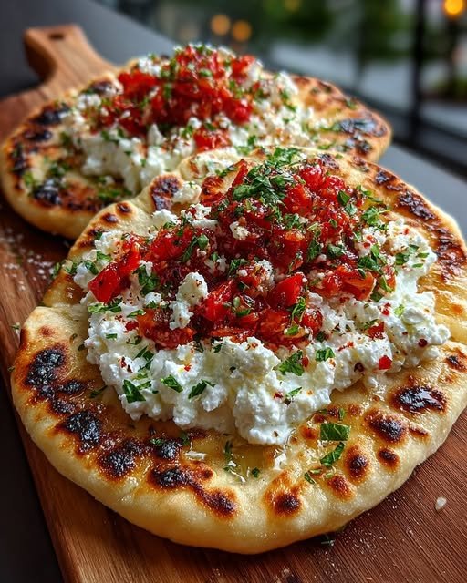 Spread the creamy feta over warm pita breads, then top generously with tomato relish. -