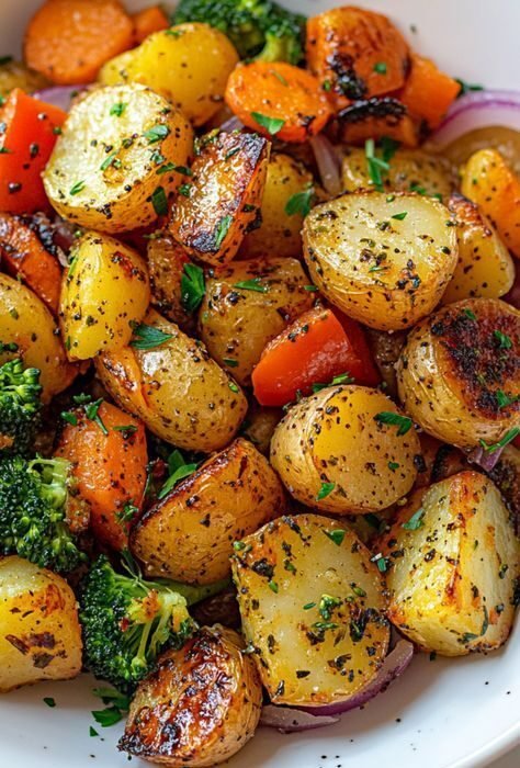Drizzle with olive oil and toss with garlic powder, paprika, salt, pepper, and herbs.