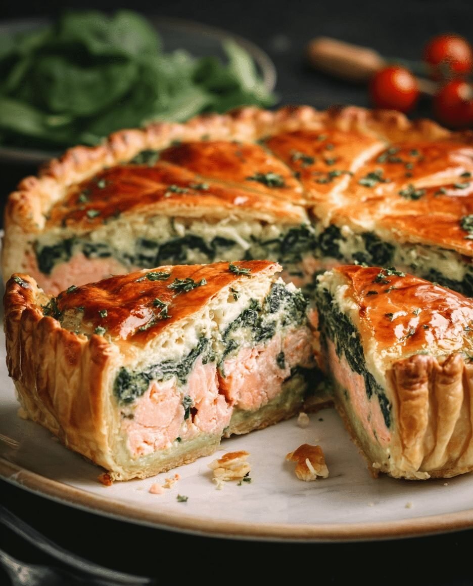 Flaky puff pastry wrapped around a savory salmon filling mixed with rice, spinach, and herbs. Crisp and golden on the outside, moist and flavorful on the inside—perfect as a main dish or a show-stopper centerpiece.