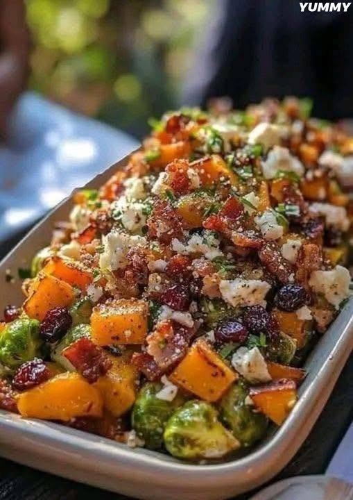 Roasted Brussels Sprouts & Butternut Squash with Bacon, Cranberries & Feta
