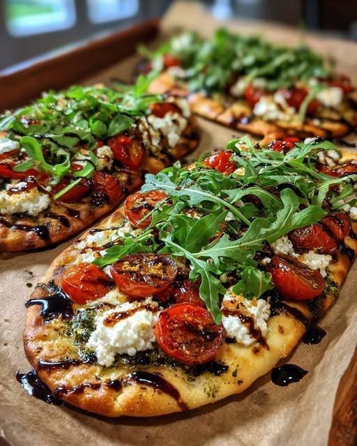 🍅 Roasted Tomato & Goat Cheese Flatbread with Pesto & Arugula