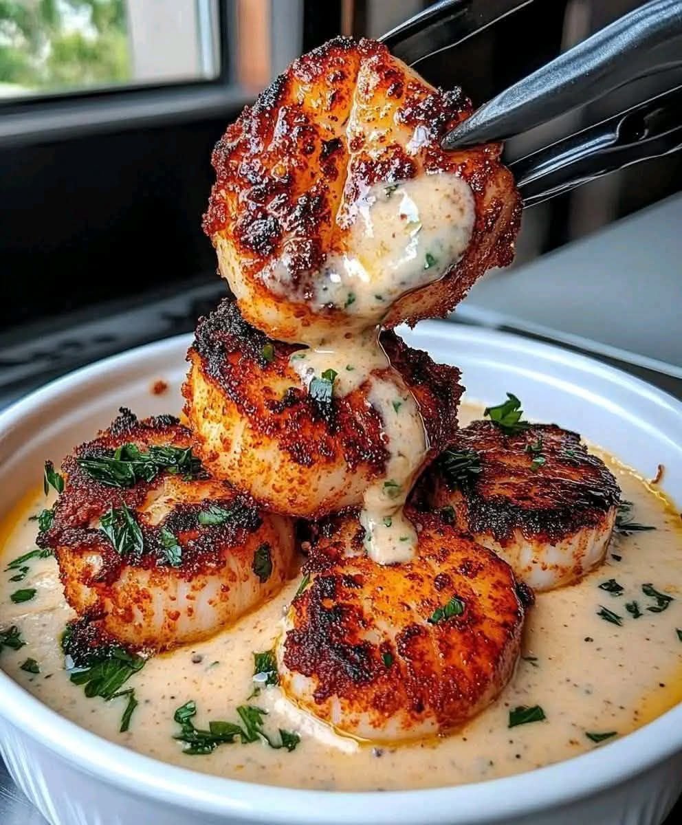 Plate it Up: Spoon Creamy Cajun Sauce onto plates. Top with seared scallops and enjoy!