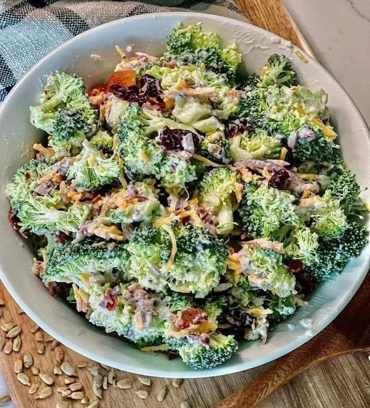 1. In a large mixing bowl, combine the chopped broccoli, red onion, raisins or dried cranberries, and sunflower seeds.