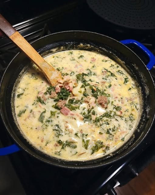 Stir in cooked sausage and kale or spinach until spinach begins to wilt.