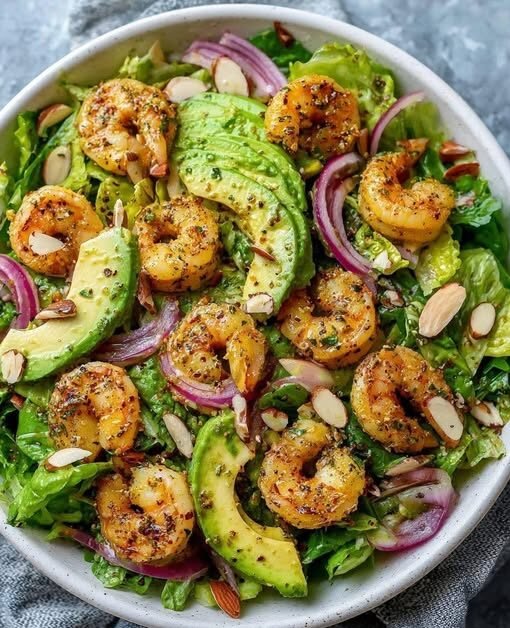In a large bowl, combine mixed greens, sliced avocado, red onion, and almonds.