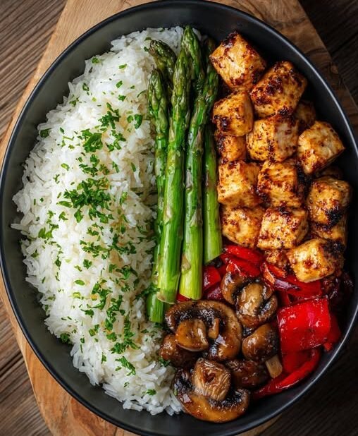 🍗 Sticky Glazed Chicken Bowl with Asparagus, Mushrooms & Rice