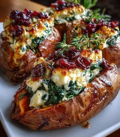 Stuffed Sweet Potatoes with Spinach, Cheese, and Cranberries