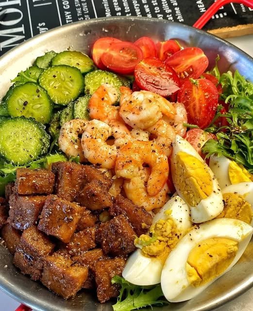 A high-protein, nutrient-packed salad combining juicy steak and succulent shrimp with fresh greens, creamy avocado, and a bold Mediterranean-style dressing. Perfect for fitness, keto, or hearty meals.