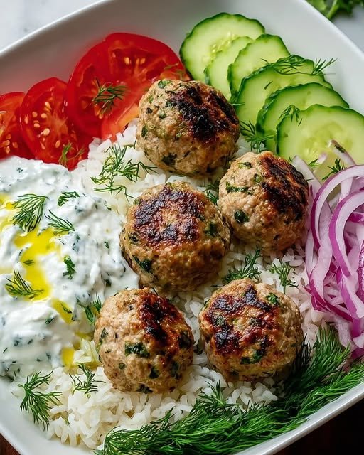 🇬🇷 Ultimate Greek Meatball & Rice Bowl with Homemade Tzatziki & Crisp Veggies