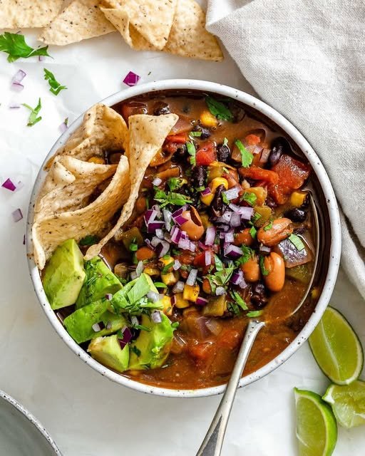 Ladle chili into bowls. Garnish with diced avocado, red onion, cilantro, and serve with tortilla chips and lime wedges on the side.