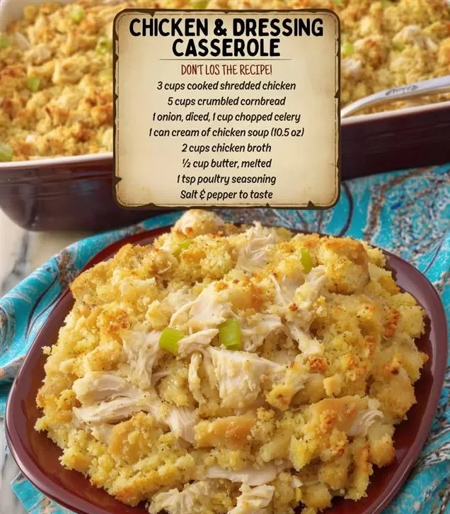 Tender shredded chicken, buttery cornbread, and savory herbs come together in one comforting bake that tastes like Thanksgiving at Grandma’s — warm, hearty, and full of love. 💛